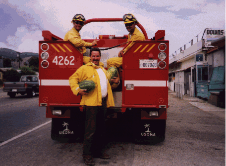 At least we saved the melon crop! (Capt. Roger Maybee (front), and firefighters Mike Weidner and Jarrod Clinkenbeard look forward to a refreshing break from the action.) | |