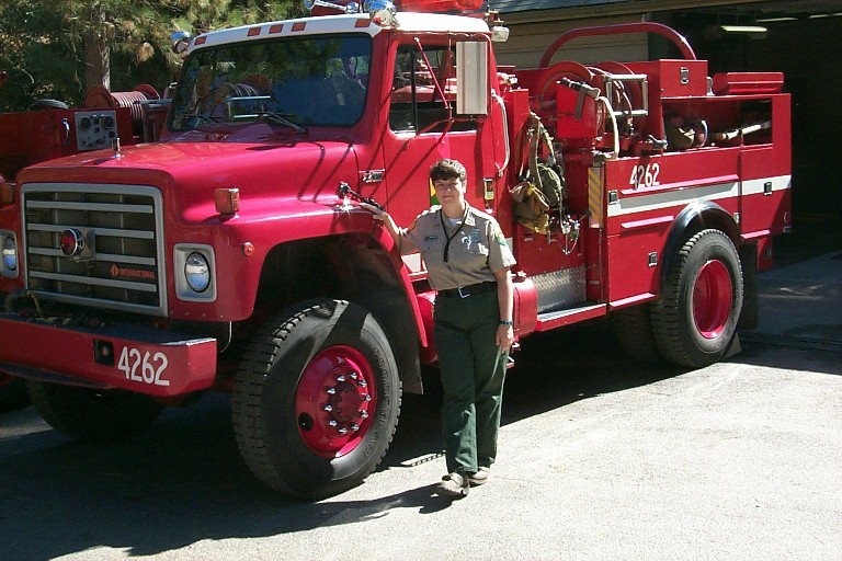 Jennifer & Usona’s Engine 4262 | Jennifer Neely with engine 4262 from Usona, Mariposa County, at a 1997 prescribed burn in the Catheys Valley area. (Photo by Mike Weidner) |