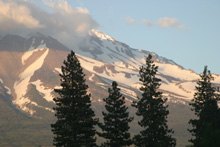 Mt. Shasta through the trees to the east, and Black Butte, a volcanic cinder