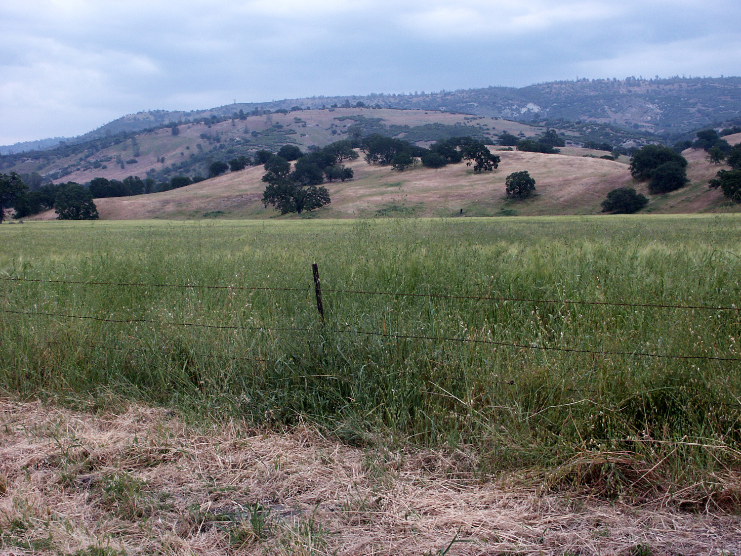 lush creek bottom with brown hills rising abruptly about 40 feet