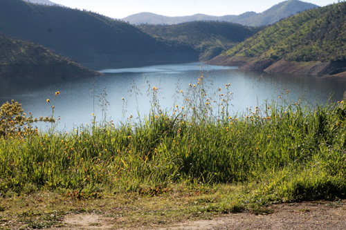 Flat Reservoir, close to the lake most of the way. There are two large tributaries running into the lake on this side, Sycamore Creek and Big Creek. The road goes up hill and away from the lake over the divide between the two creeks, and along this stretch there are two campgrounds and a picnic area. At least there USED to be. They have been closed for decades, with locked gates across the entrances. However, they are accessible for walking, and the