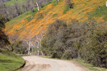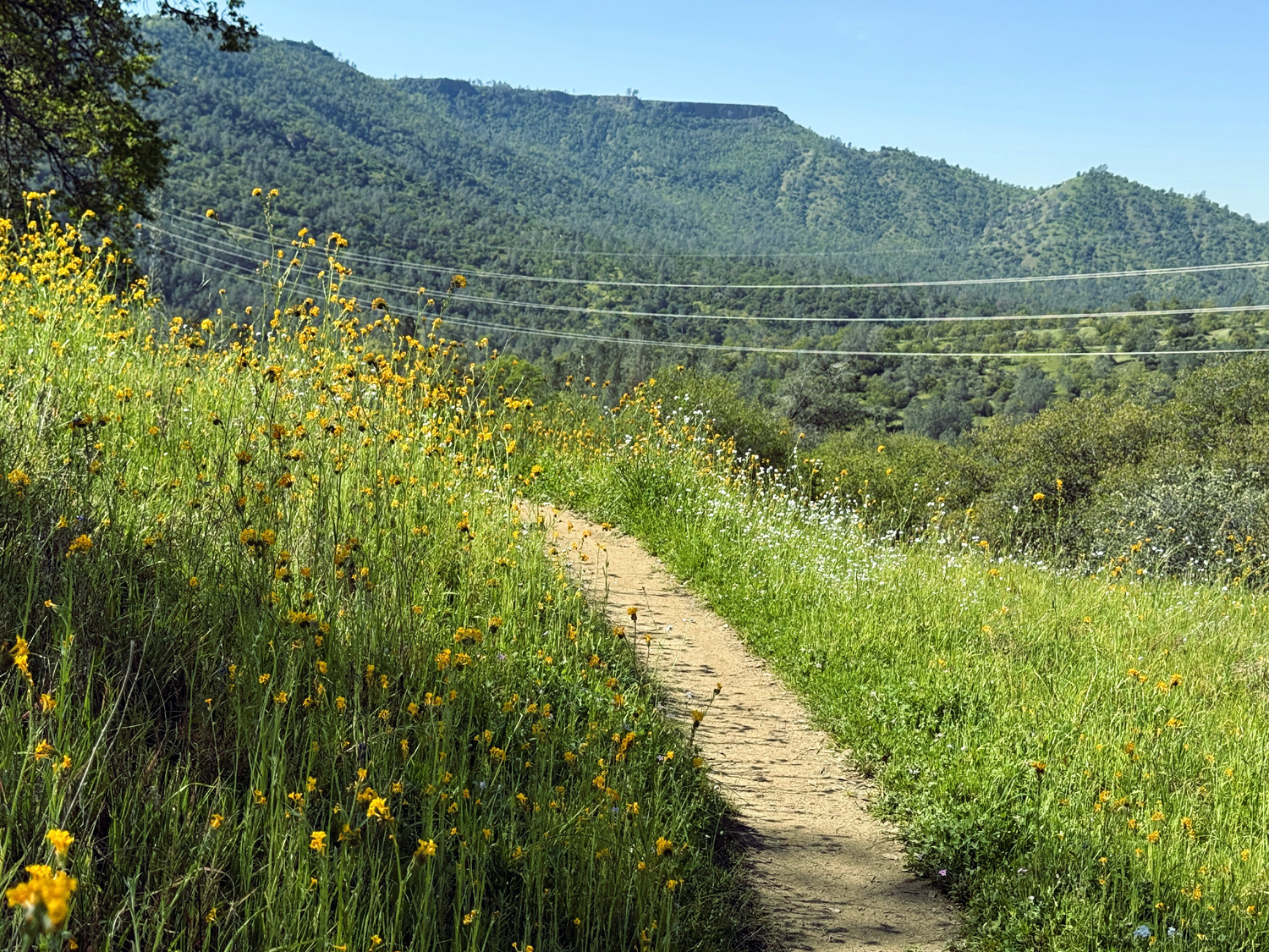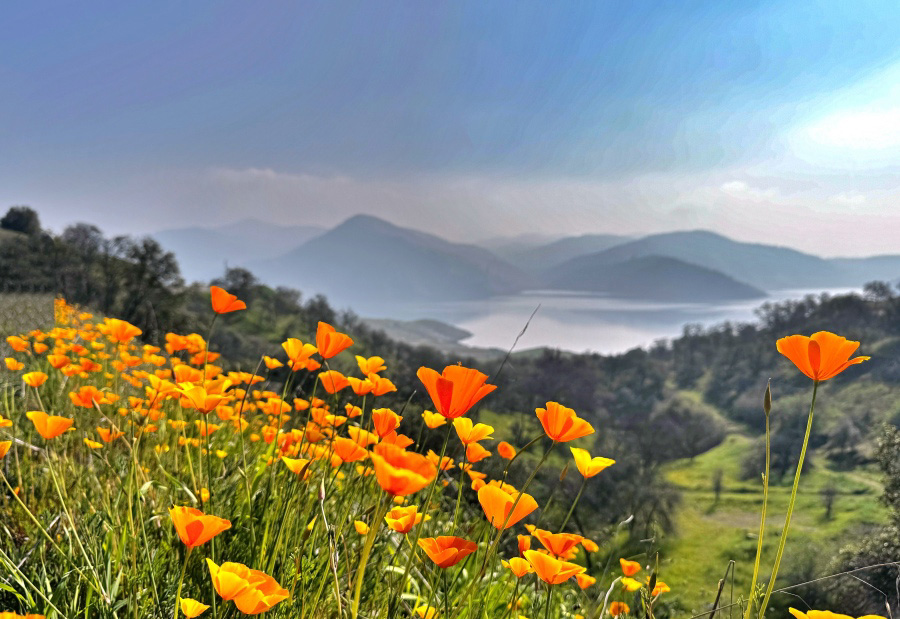 poppies, lupines, redbud, miner's lettuce, harvest brodiaea, blue
