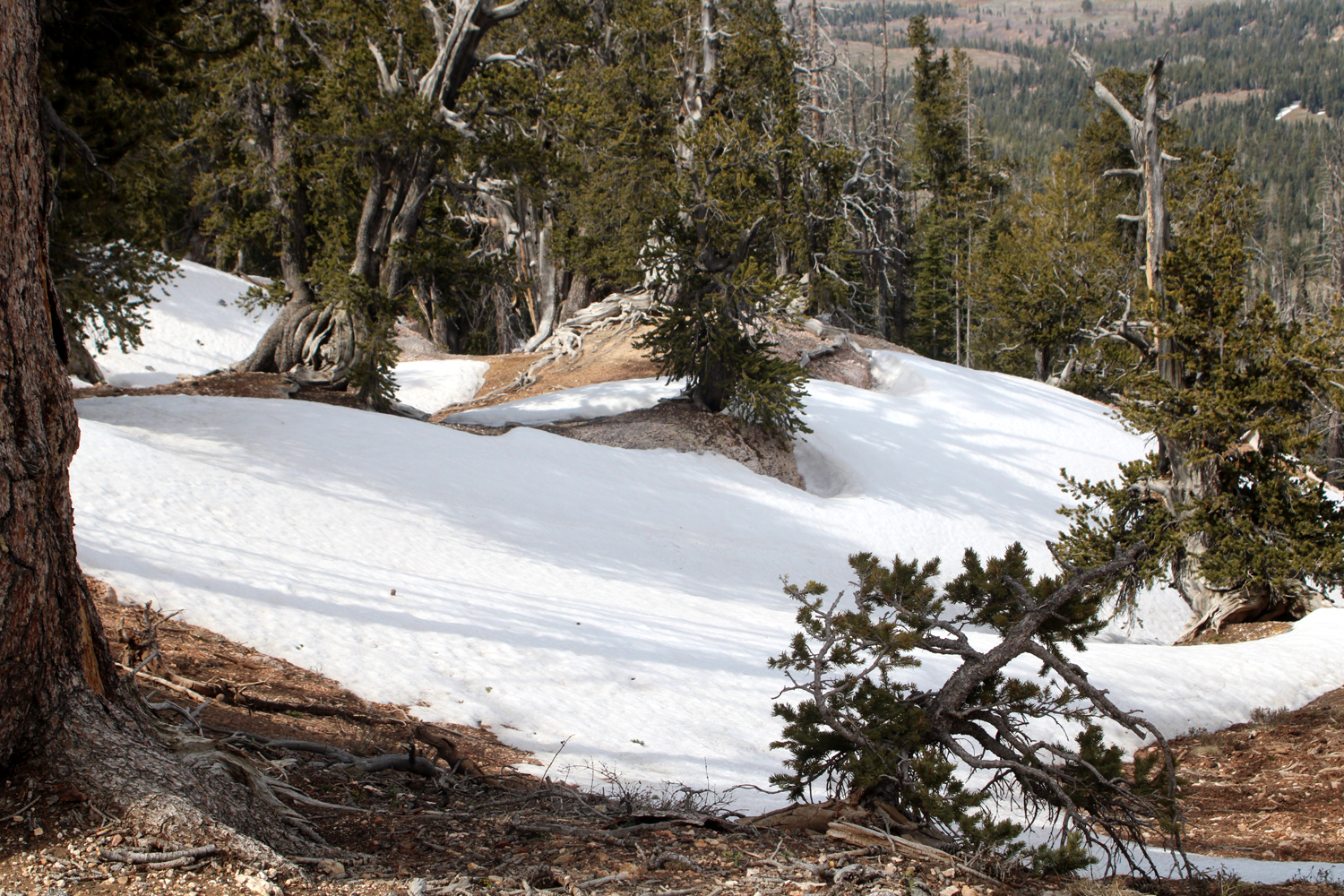 the highest elevations, bristlecone pines and snow-covered