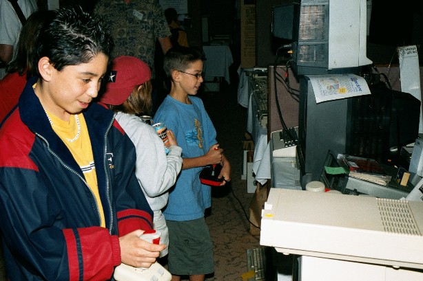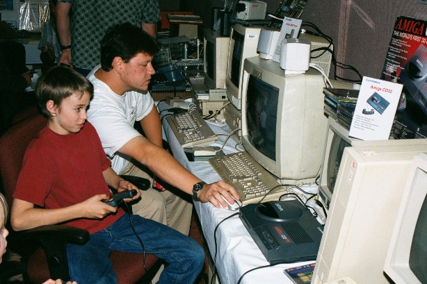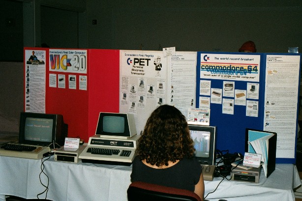 Ed Hart (left) letting young on-looker try out a Commodore game | Lots of kids playing games with the Commodores at the FCUG table | Bill Bosari's Amiga exhibit table |