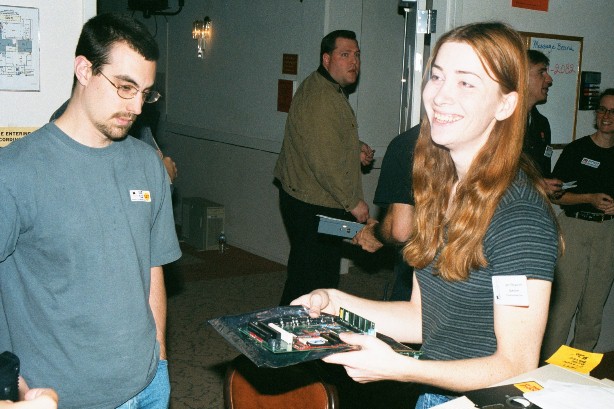 Jeri Ellsworth (right) showing off the Rev. 0 CommodoreOne prototype board | (l to r) Jeri Ellsworth, Clarke Murphy and Ed Hart of the Commodore Hayward User Group, Cameron Kaiser looking at the CommodoreOne |