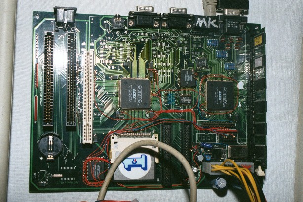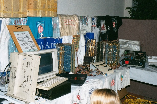 Dale Luck's exhibit table with parts of the Amiga Lorraine | The CommodoreOne Rev. 0 prototype board | Jeri Ellsworth and Clarke Murphy of the Commodore Hayward User Group |