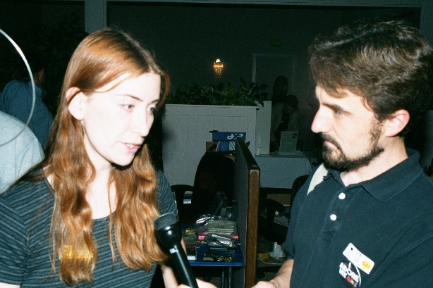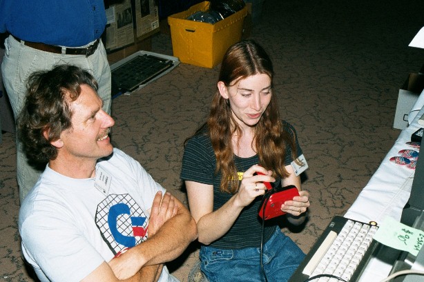 Jeri Ellsworth (left) being interviewed by Justin Beck of Berkeley radio | Dale Luck (left) with Jeri Ellsworth, playing Wings of War at the FCUG table | Todd Elliott, programmer of the geoWrite 128 2.2 patch and others |