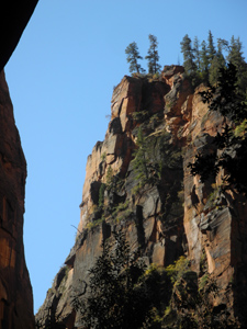The dark spot left of center is just above the upper pool; the cliff above the lower pool is directly below | One of many delightful rugged Utah junipers | View of the Virgin River on the last section of trail coming down to the Grotto | |