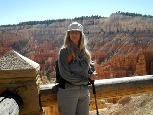 A trail zig-zags down into the canyon | Teri at Sunset Point | Like all trail signs, this is an approximation; we measured a full two miles, including wandering around | |