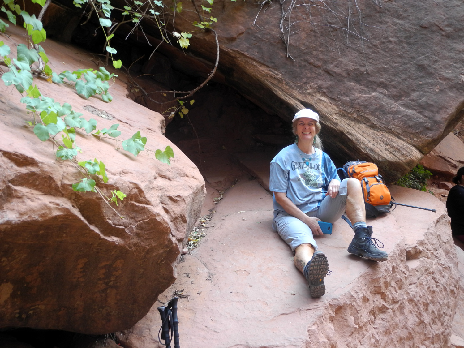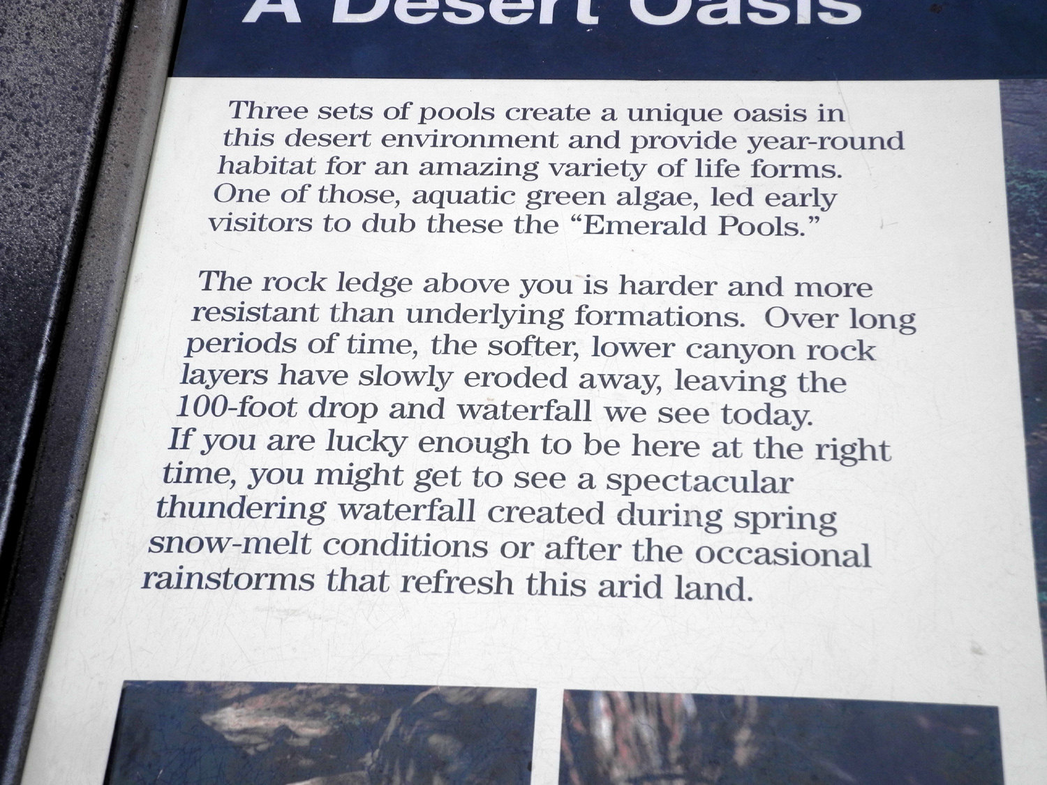 Juniper along the Pa'Rus Trail | Emerald Pools informational sign | Dick takes a rest on the Emerald Pools Loop | |