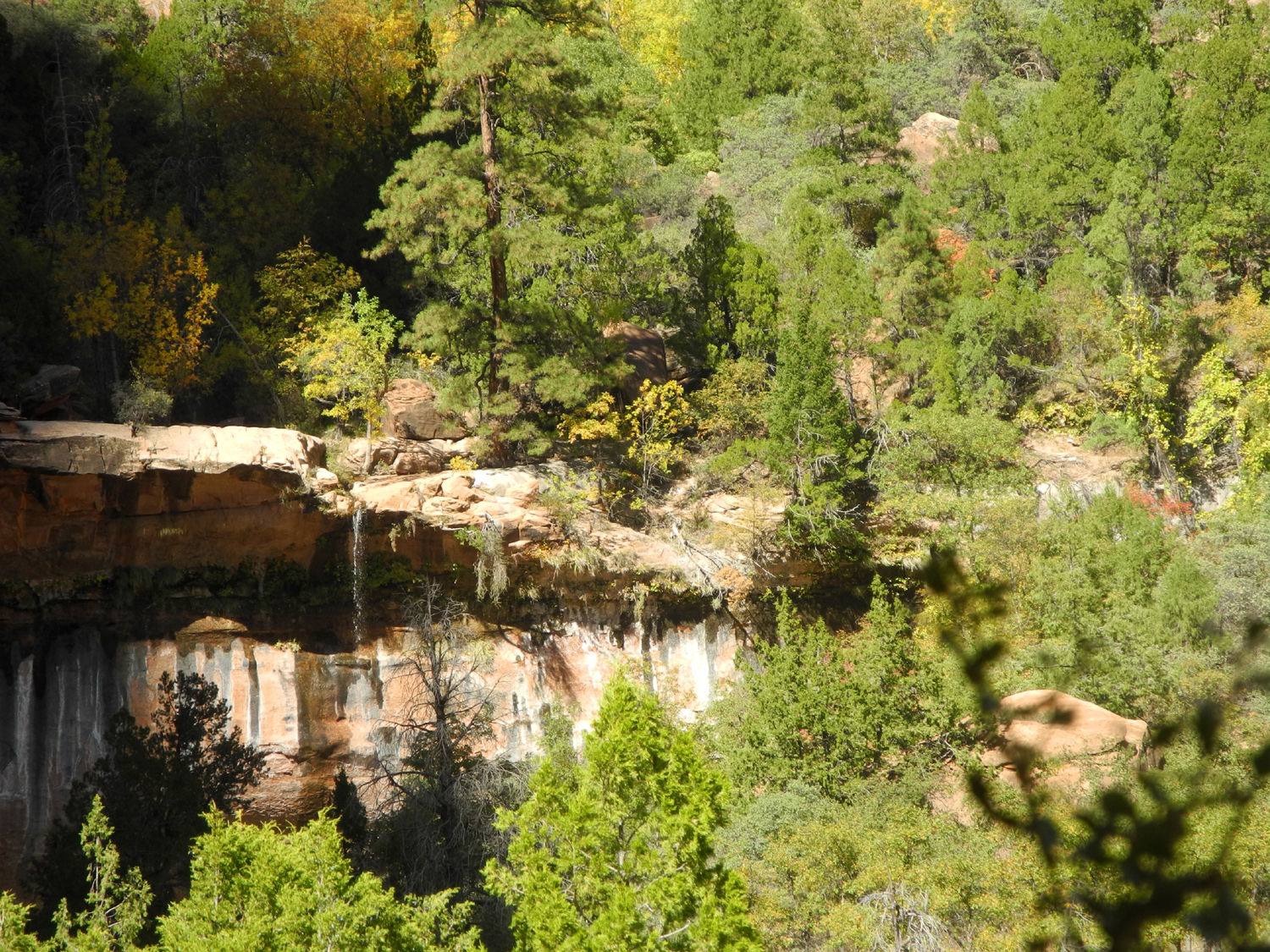 The next day our hiking plans were a bit more ambitious, and we got in a lot of mileage. We actually did a little extra hiking before we got to the real hike. The bus stop in front of our RV park was the next to last one in town, and two shuttles passed by without stopping, already filled to capacity with visitors from the earlier stops. We finally decided to just walk to the park entrance, a distance of seven tenths of a mile. Once past the entrance, we waited in a long line to get on the park shuttle, but finally arrived at our "real" starting point. Across from the Zion Lodge, west of the river, is a side canyon that contains a series of pools, known as the Emerald Pools. They are all fed by the same seep high on a cliff at the head of the canyon. A trail goes up to all three pools, although many hikers just go to the first or first and second pools, and skip the steeper, more rugged route that goes to the final one. However, we are undaunted, and planned to try for the full route, which would take us out to the next shuttle stop to the north via the Kayenta Trail. The trail went uphill gently, and provided fantastic views at every turn. On this route for the first time we began seeing bigtooth maples, which were changing to fall colors. They ranged from light pink to fiery red, and stood out against the green of juniper, fir and Gambel oaks that had not yet started to change. We arrived at a spot where we could see the 100-foot waterfall that fed the first pool. It was just a small trickle, but during heavy rainfall, becomes a raging torrent. Since we had to walk behind it and get a few drops on us, we were just as glad to miss the peak flow. Approaching, crossing, and going up the hill past the pool, we had a variety of different views of the waterfall as well as the countryside surrounding us. We also had a view of a lot of other hikers, but expected the crowd to thin out as the trail became more difficult. It was just a short distance to the second pool, which may have been the most scenic of the three, but after that the route became steeper and more challenging. In spite of this, there were still lots of other hikers of all ages. The final approach to the upper pool is steep and rocky, with no real trail down the final hundred feet, just different paths through what is essentially a big rock pile. We made it down to what would prove to be the largest of the three pools, although there was really no waterfall dropping down the cliff, just water seeping out of the rock and forming a little creek. We found some fairly flat rocks to sit on while we had our snack and enjoyed being in an oasis in the desert. The return trip from this pool requires backtracking on the trail to a junction, where you can return the way we came, or continue the loop to the other trailhead. This was a fairly long stretch, but always with something new and interesting to see. At one place we could see the entire cliff above the pools, and tell that all three were formed by the same creek. We were on the drier side of the canyon here and started seeing rugged Utah junipers. On the southern side, with a bit more moisture, they had been green and even from top to bottom, but this section clearly offered harsher conditions, and the dead tops and twisted trunks were more in line with what we see in the Sierra junipers in California. As we came out of the side canyon into the valley of the Virgin River, we had many nice views of the river below. The trail started down along the red sandstone cliffs, and finally reached a foot bridge where we crossed over to the Grotto shuttle stop, and rode back to camp, with about five miles of hiking on the books. |