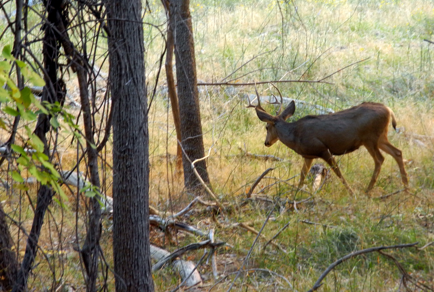 Deer along the River Walk | Approaching the River Walk trailhead | Gambel oaks along the Grotto Trail | |